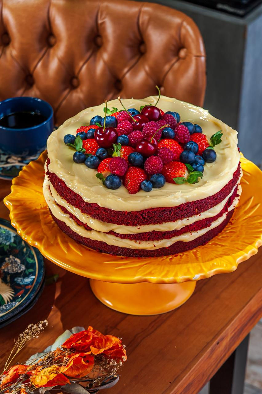 A Red cake, uma das estrelas da casa. Torta de brigadeiro branco com frutas vermelhas