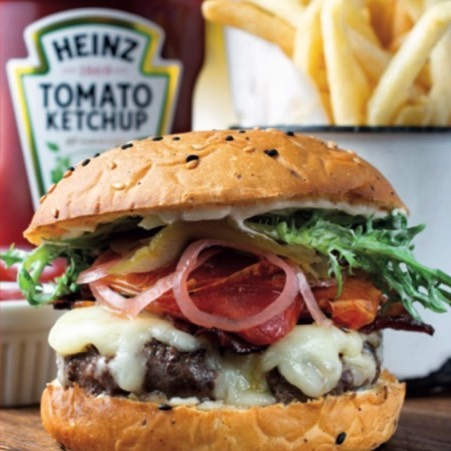 Filho de Quem? : 180g de carne suína lentamente defumada e temperada, bacon grelhado em chama aberta, adornado por uma cama de banana assada, suave cobertura do queijo Monterey Jack e cabeleira de couve crispy. No exclusivo pão brioche caramelizado, uma leve camada de geleia de bacon (R$ 32,90).